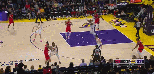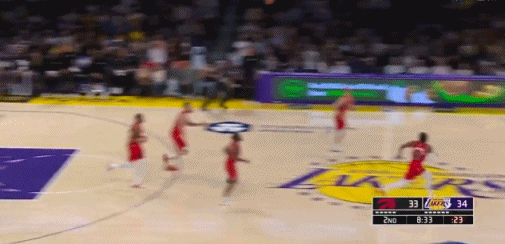 首节比赛中,詹姆斯手感并不好,他仅有一次长两分命中,单节3中1得到2分。进入次节比赛后,詹姆斯开始火力全开,他连续中投得手,此外持续冲击猛龙队篮下得手,一人独得11分带领湖人队打出进攻高潮,在上半场结束的时候保持一分的领先。